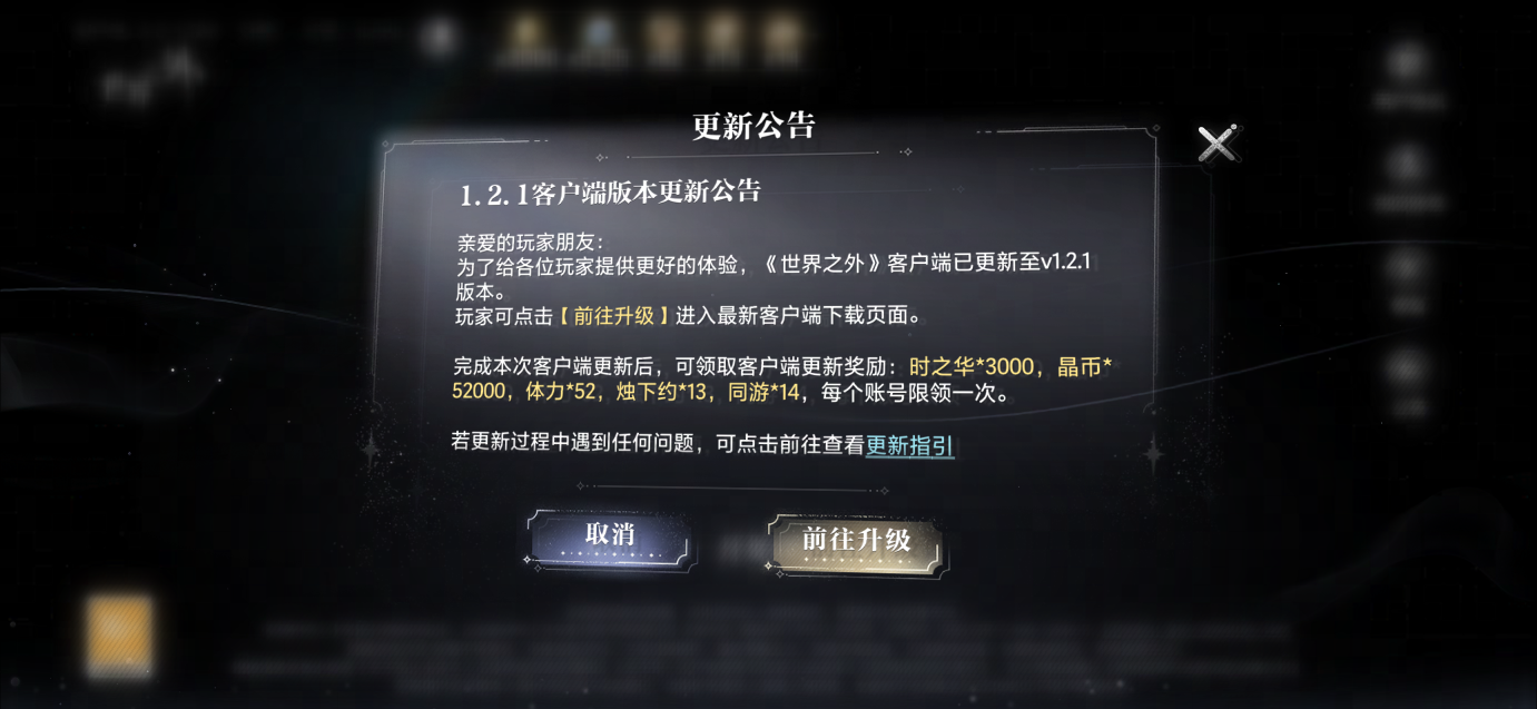 为了给玩家朋友们提供更好的体验,《世界之外》客户端进行了更新,最新版本为1.2.1。8月15日最新客户端上线后,玩家可通过登录界面的更新提示前往下载新客户端,完成更新后,可进入游戏邮箱领取【时之华*3000,晶币*52000,体力*52,烛下约*13,同游*14】(2025年8月15日23:59:59前注册的账号可领取,每个账号限领一次)。